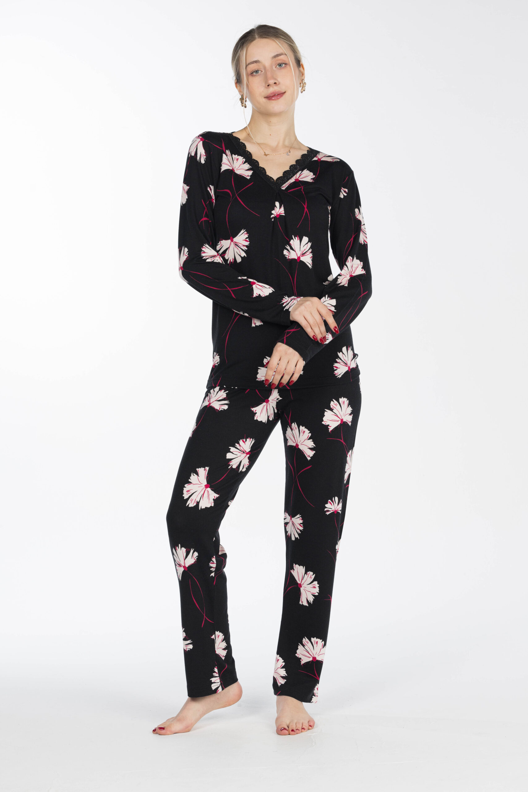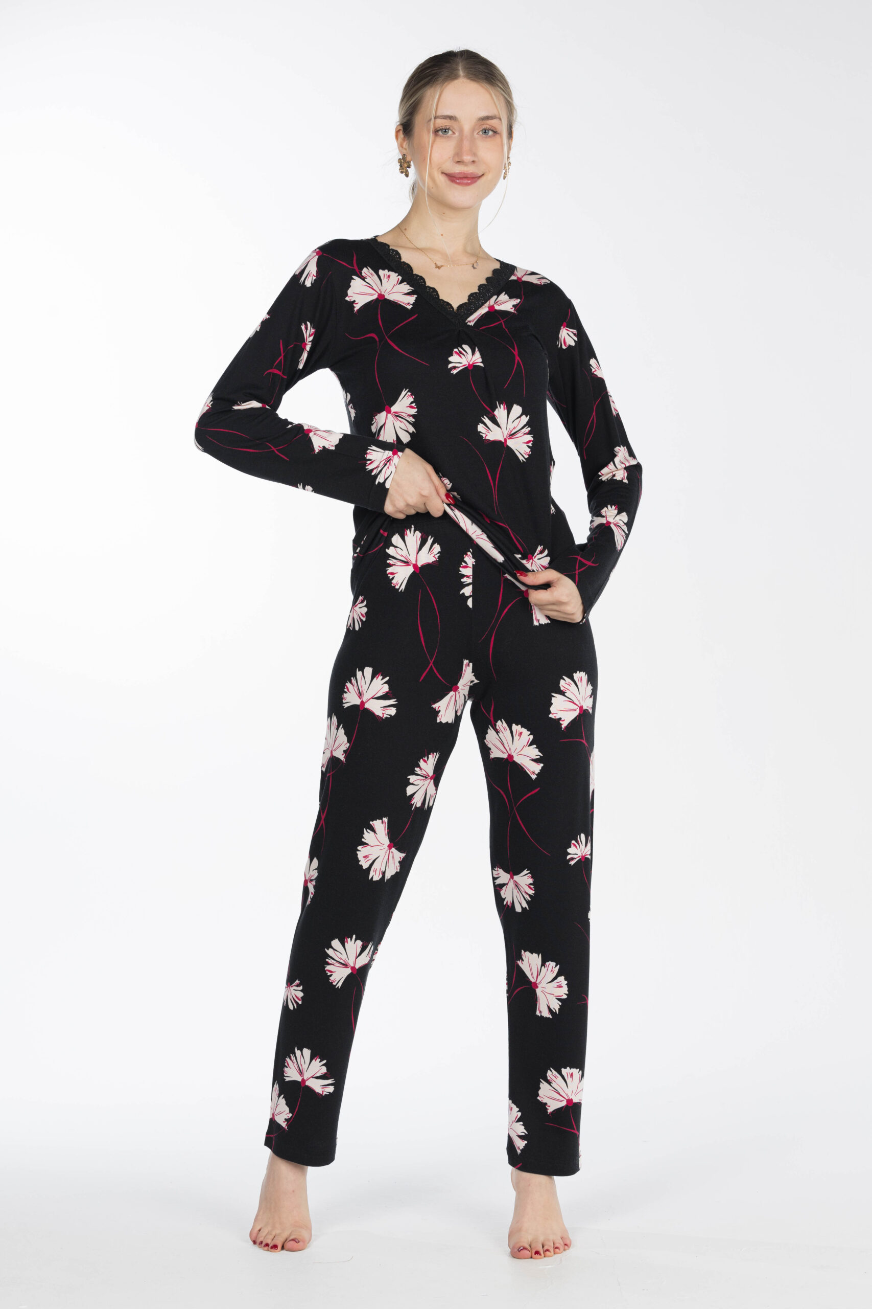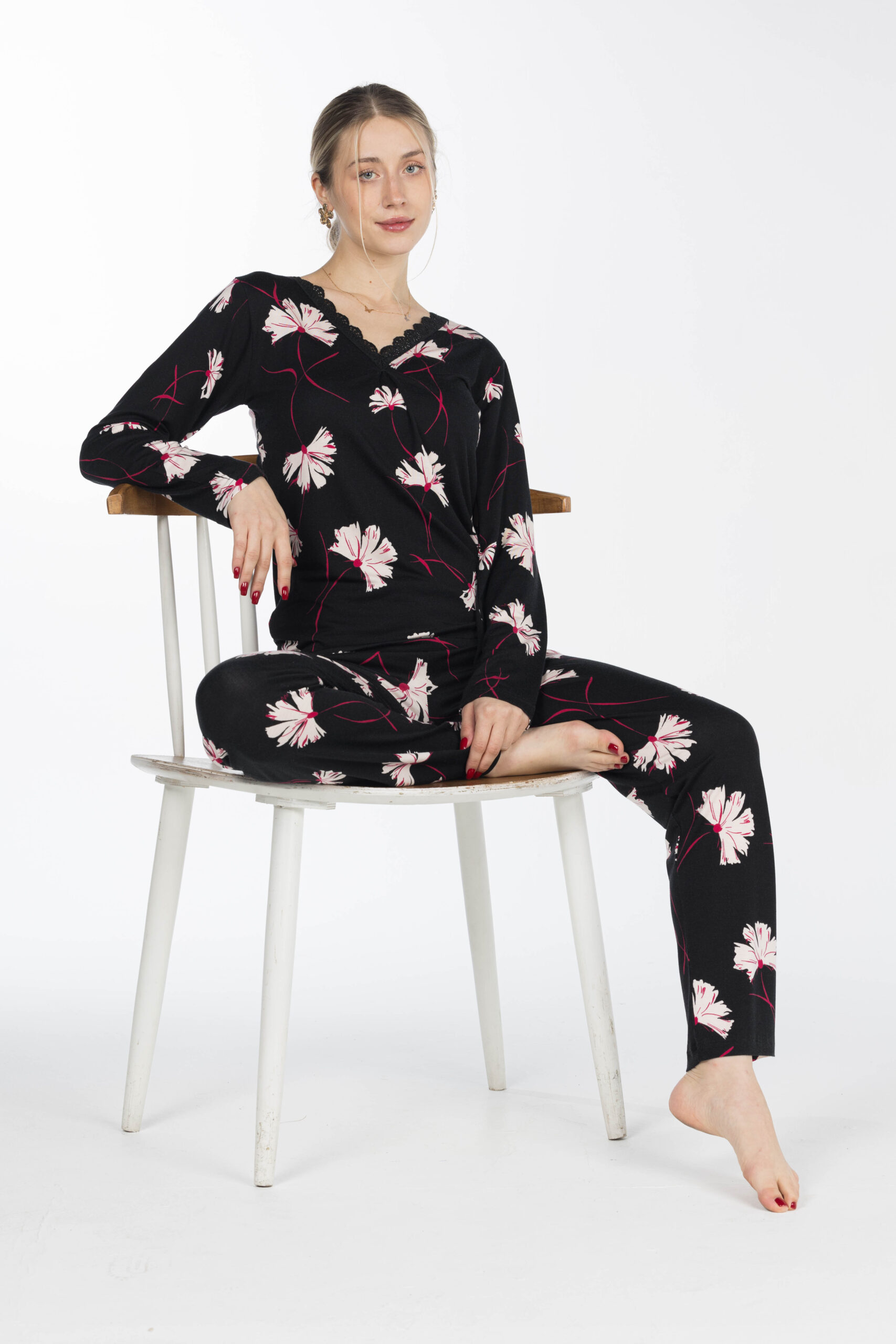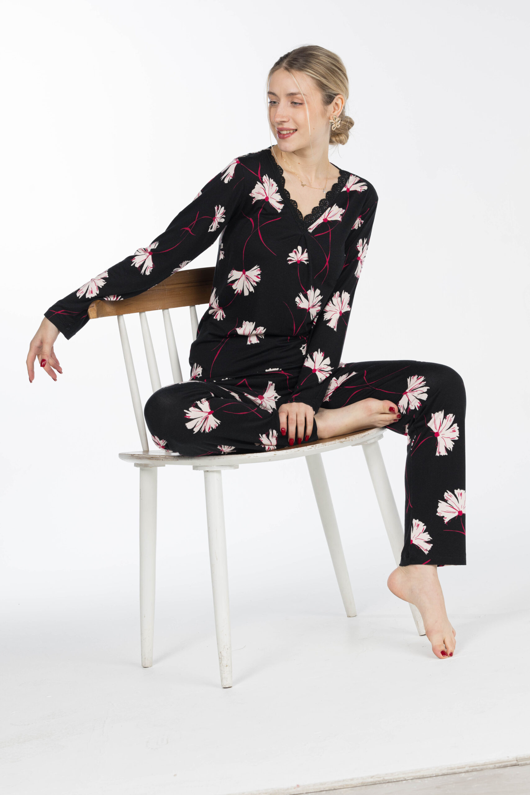 تصميم عصري بنقشة جذابة يضيف لمسة أنثوية راقية، مثالي للارتداء داخل المنزل أو أوقات الاسترخاء